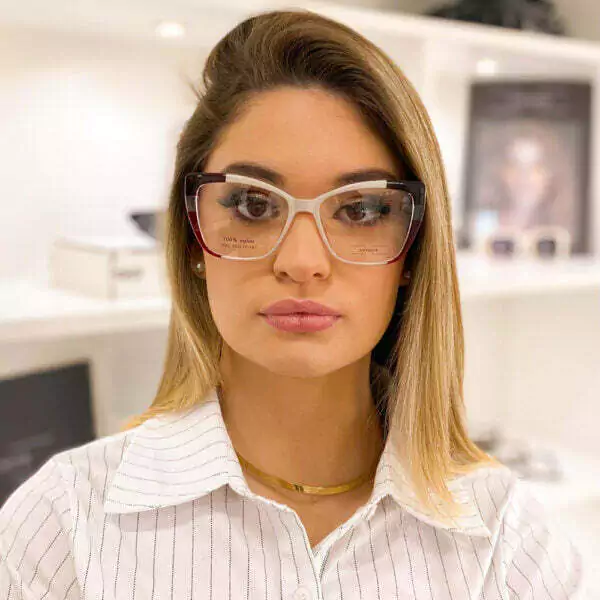 A armação de grau Jordana é uma peça estilosa e moderna, sua frontal possui três tons diferentes nas cores nude, marrom e vermelho, suas hastes em metal são revestidas em acetato deixando detalhes em dourado à mostra, tornando a peça perfeita para quem busca um óculos cheio de autenticidade.