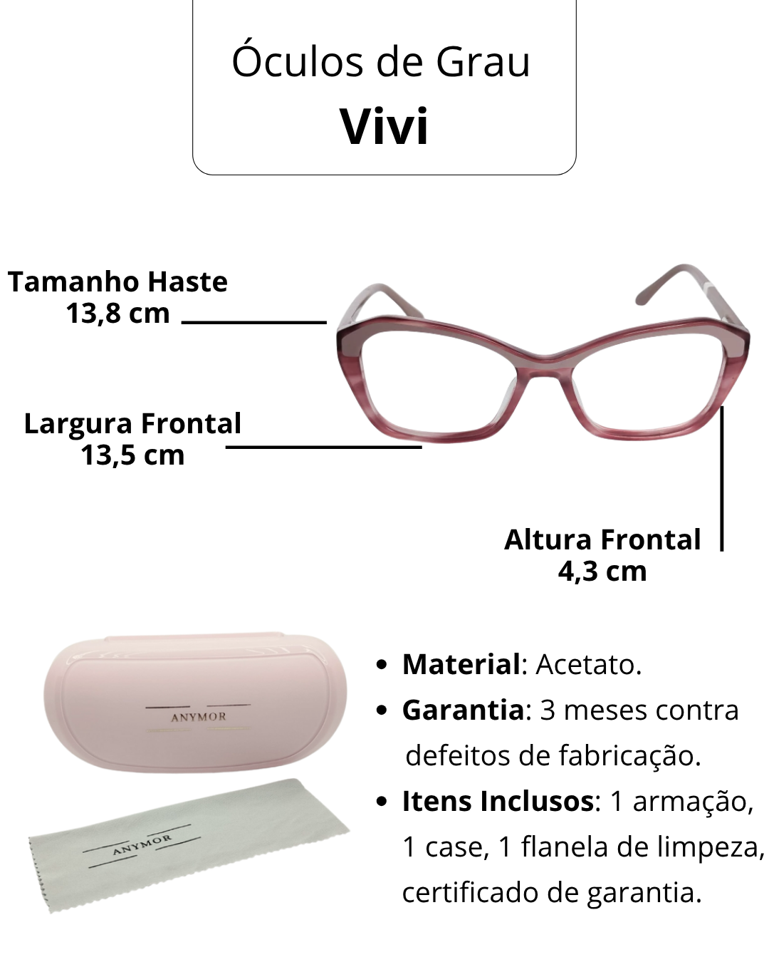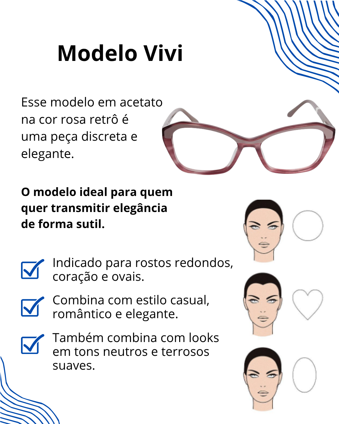 A armação de grau Vivi possui frontal na cor rosa retrô, trazendo um acabamento em tom mais claro na parte superior, o que oferece um destaque maior para o olhar, tornando a peça perfeita para quem busca um óculos no estilo romântico, discreto e elegante.
