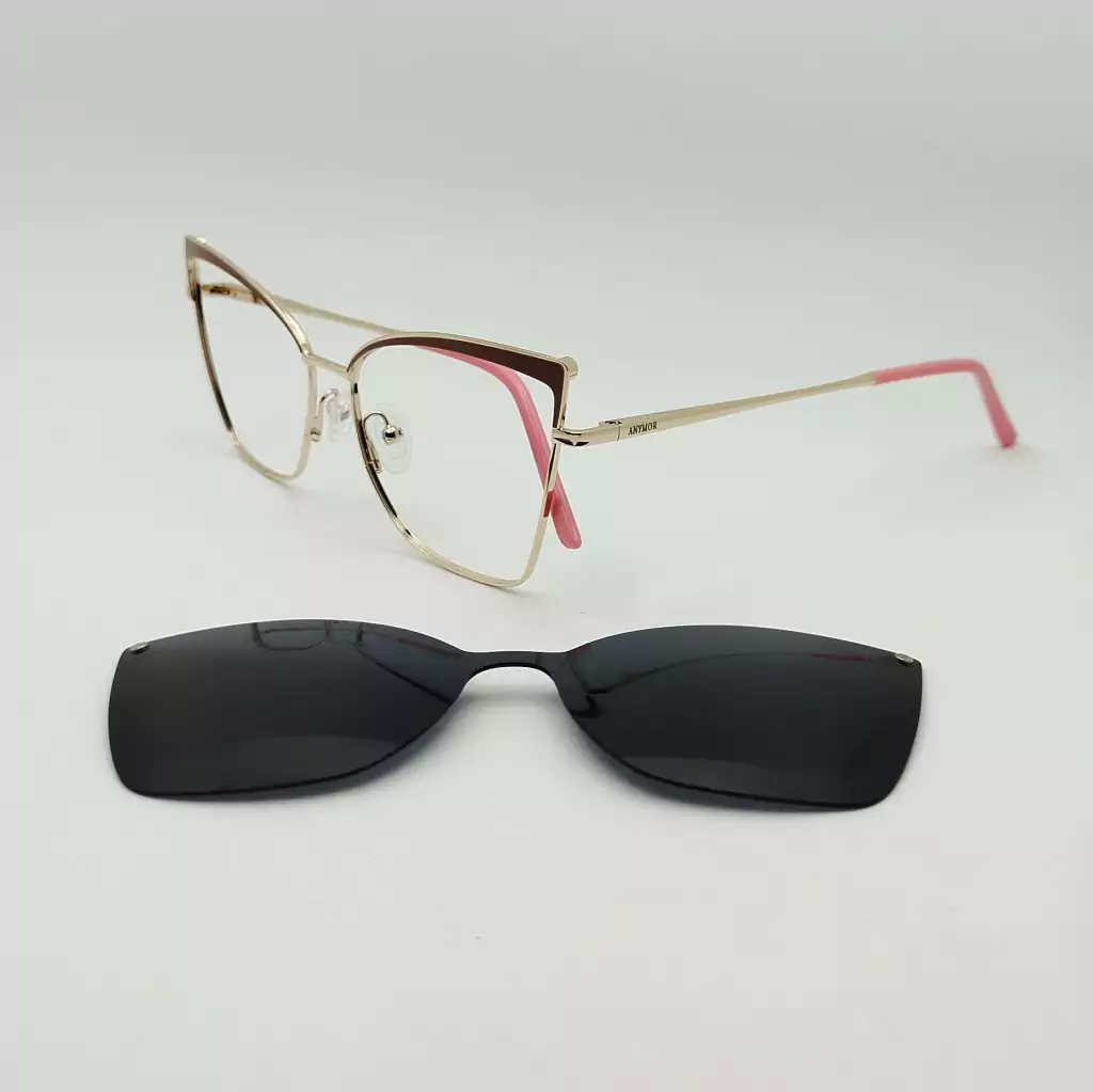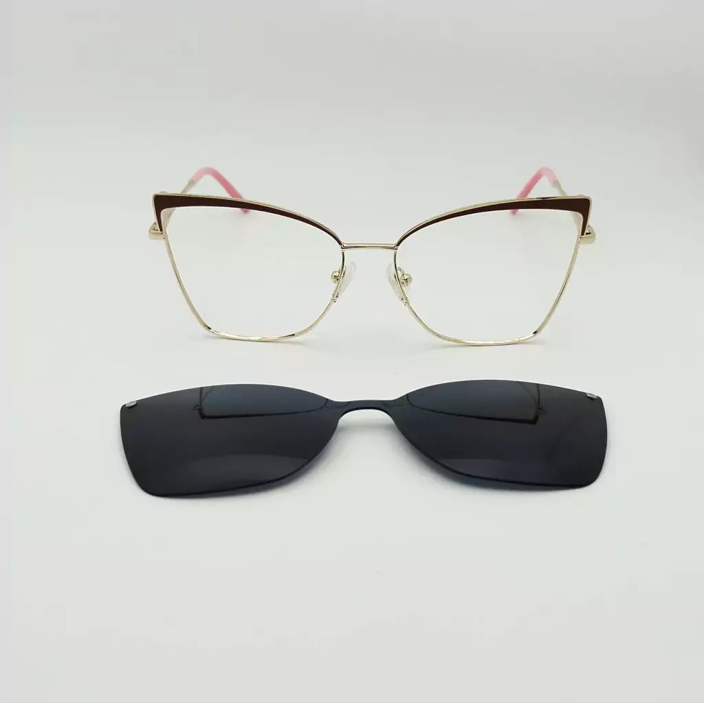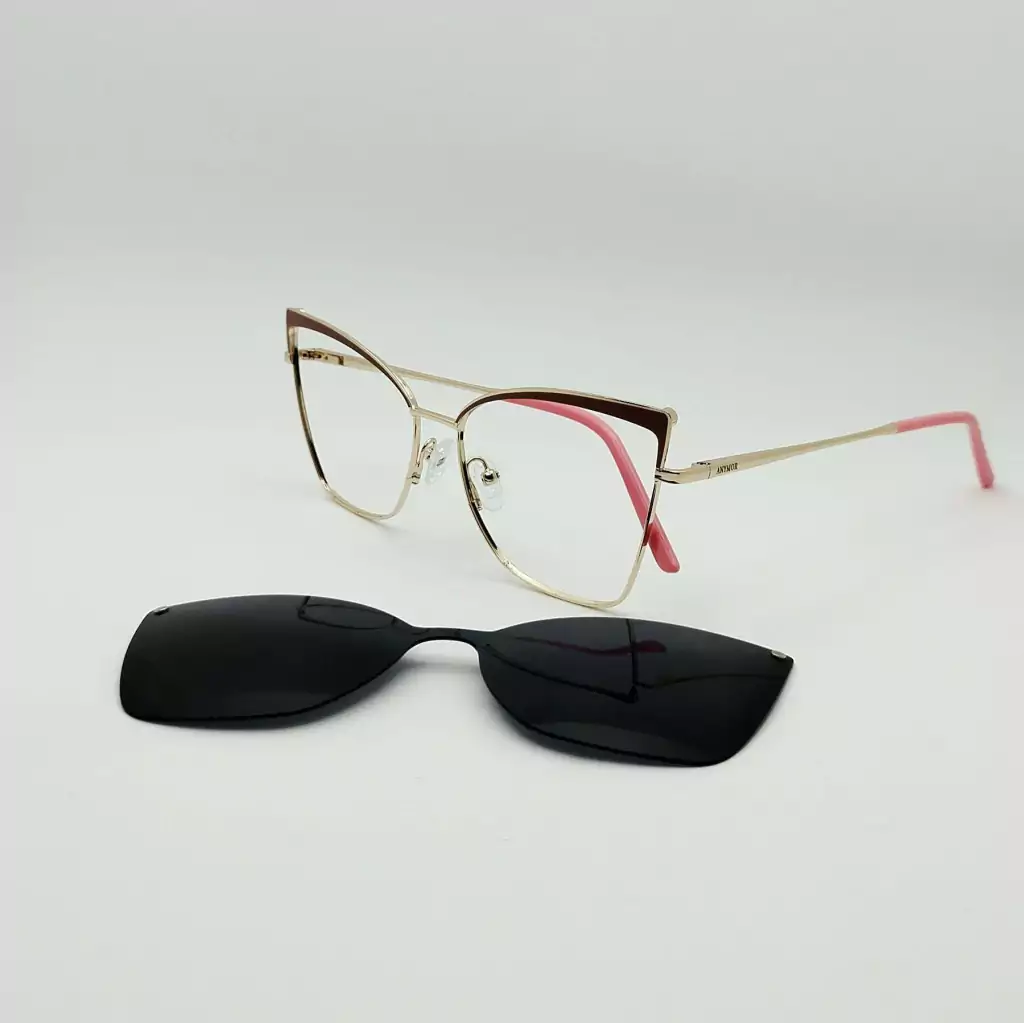 Essa armação acompanha o CLIPON, acessório que permite encaixar lentes de sol sobre a armação, tornando um modelo 2 em 1. Uma opção prática e versátil para quem usa óculos de grau e quer ter óculos de sol na mesma peça.