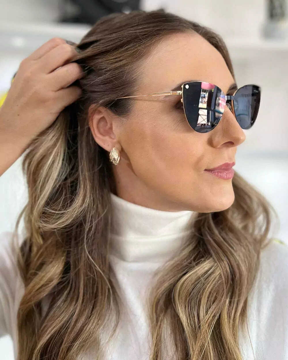 A armação de grau Antonela em metal dourado possui design gatinho, projetada para o alto trazendo um olhar mais sensual e marcado, sua frontal possui detalhes na cor rosa claro dando um toque de delicadeza para a peça.