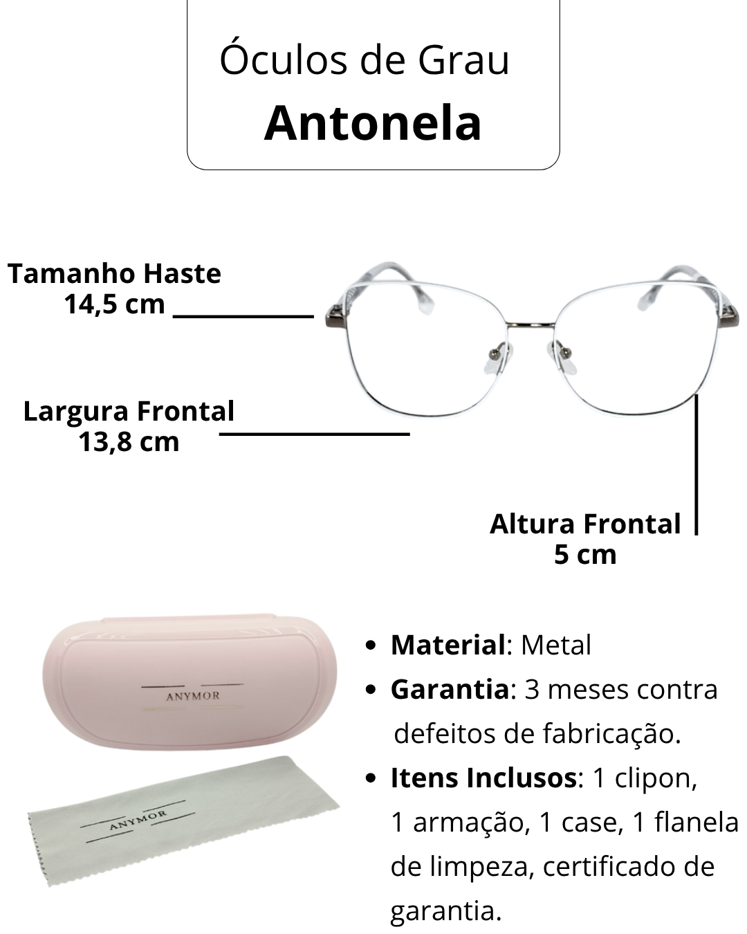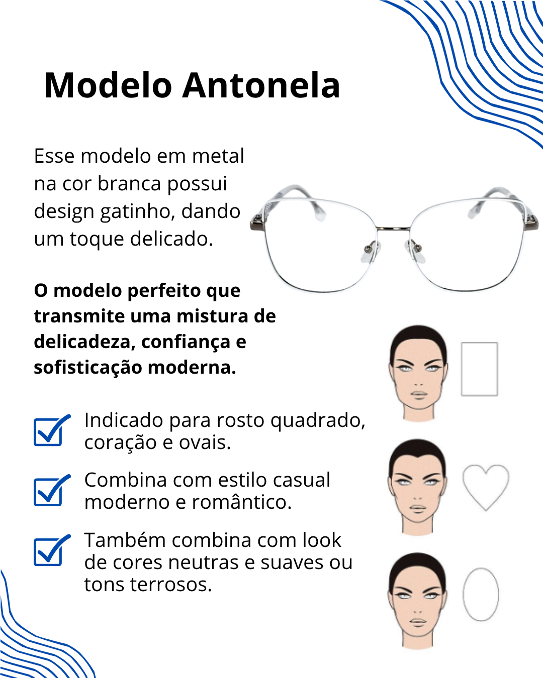 A armação de grau Antonela em metal na cor branca possui design gatinho, projetada para o alto trazendo um olhar mais delicado; ela transmite uma mistura de delicadeza, confiança e sofisticação moderna.