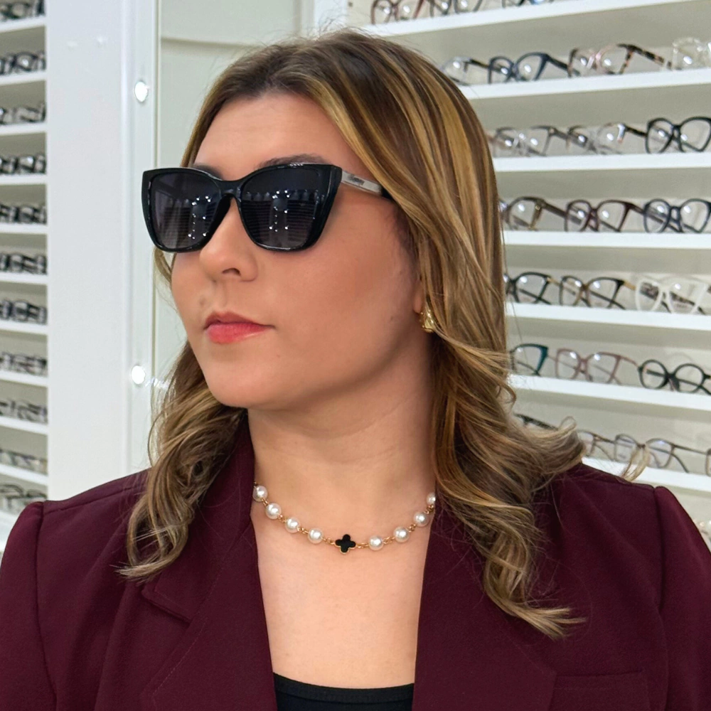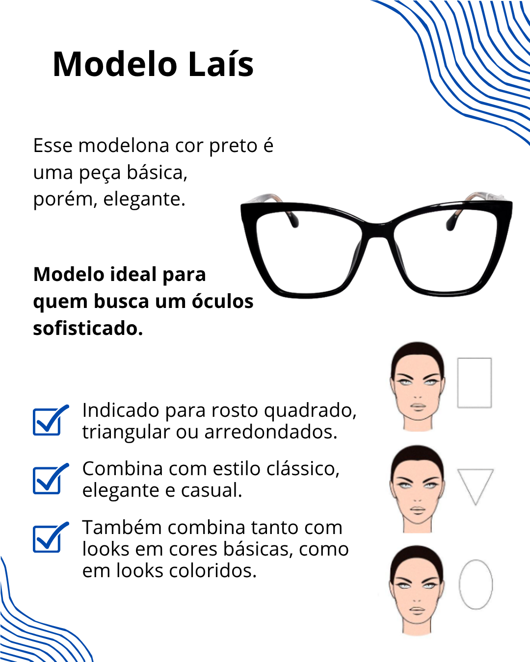 A armação de grau Laís na cor preto é uma peça clássica e elegante, sua frontal possui silhuetas geométricas e suas hastes em metal são revestidas em acetato deixando detalhes em dourado à mostra, tornando a peça perfeita para quem busca um óculos sofisticado.