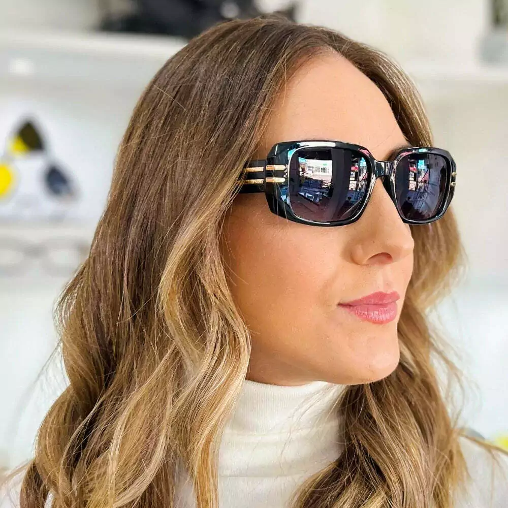 O óculos de sol Toronto na cor preto é uma peça com design ousado e contemporâneo, modelo com formato retangular mini, possui acabamento em metal dourado entre sua frontal e as hastes tornando a peça perfeita para quem busca um óculos elegante e versátil.